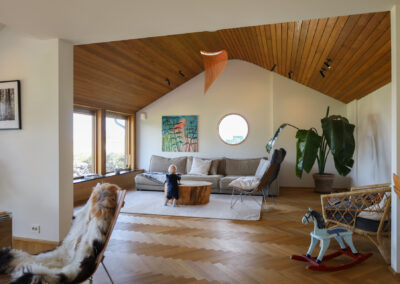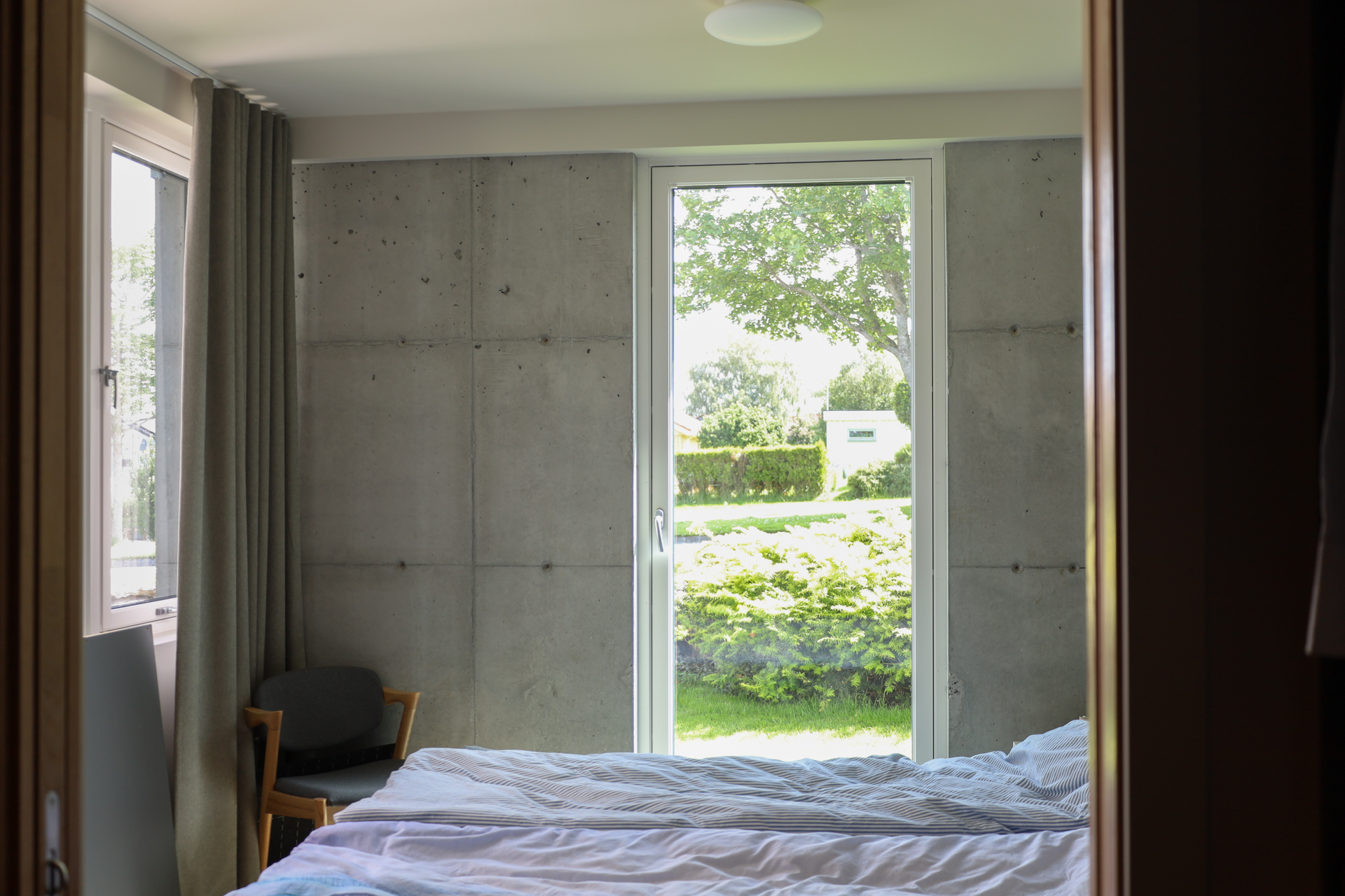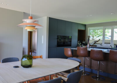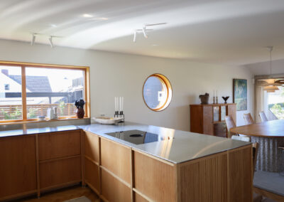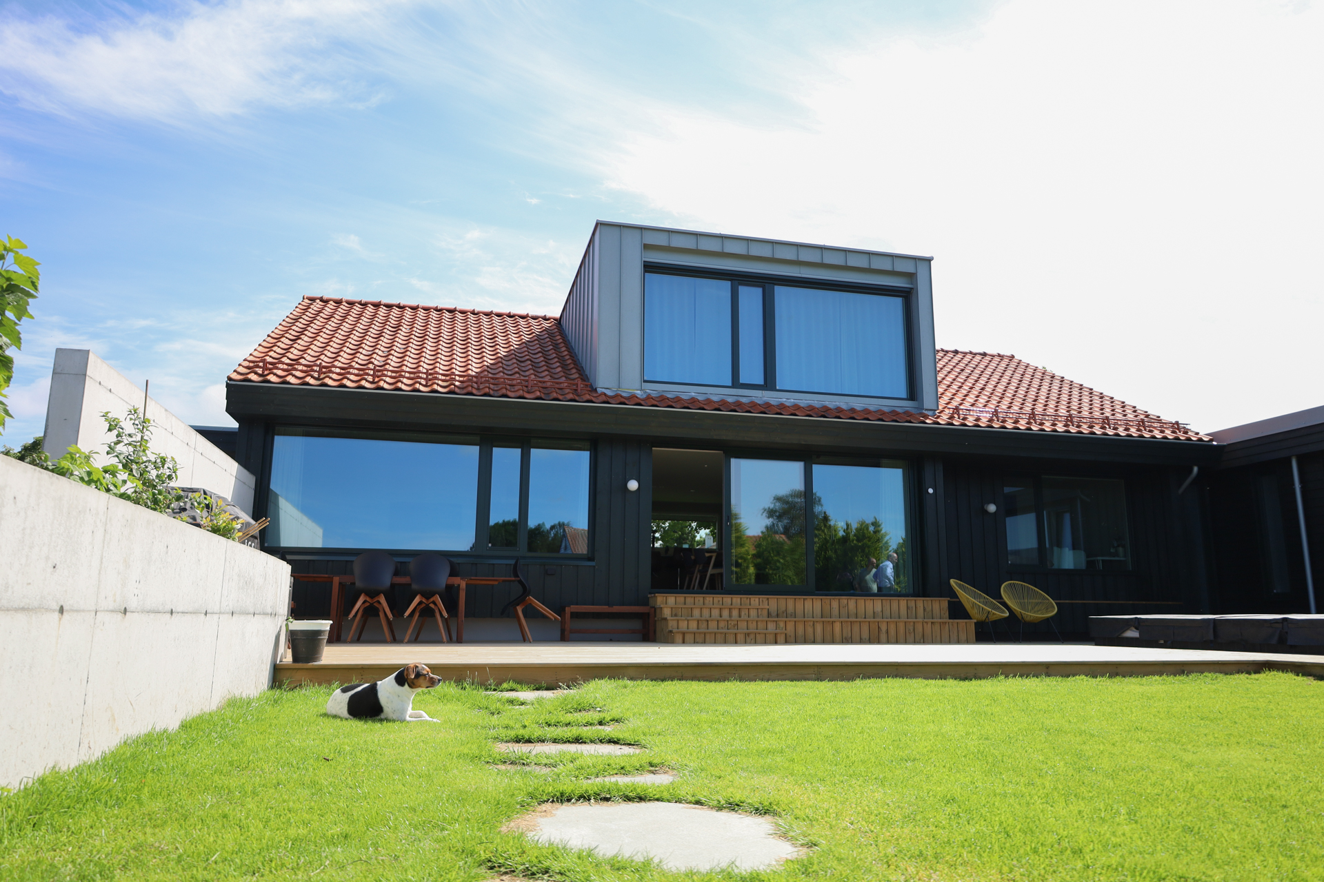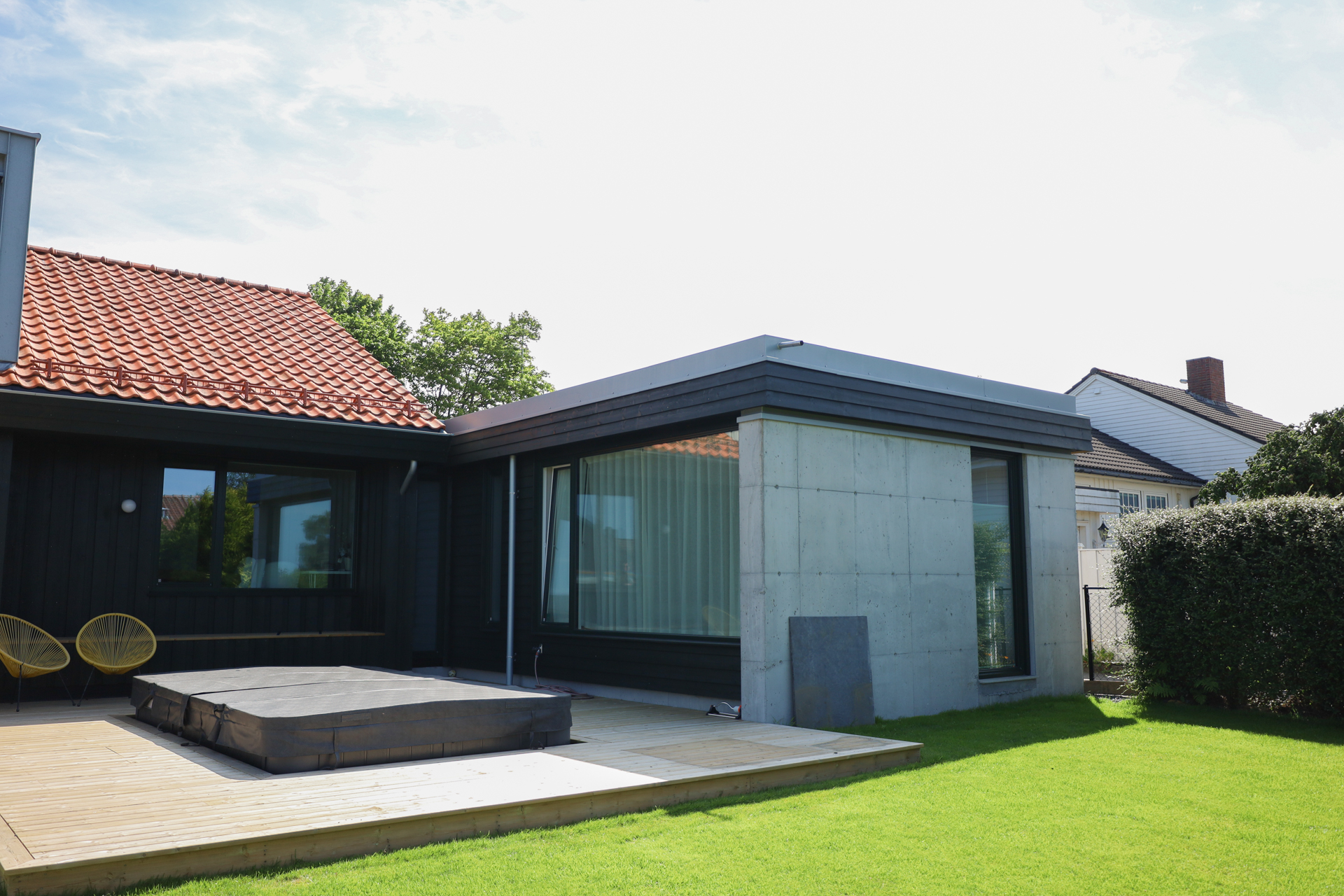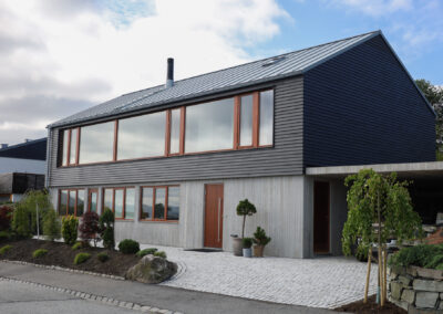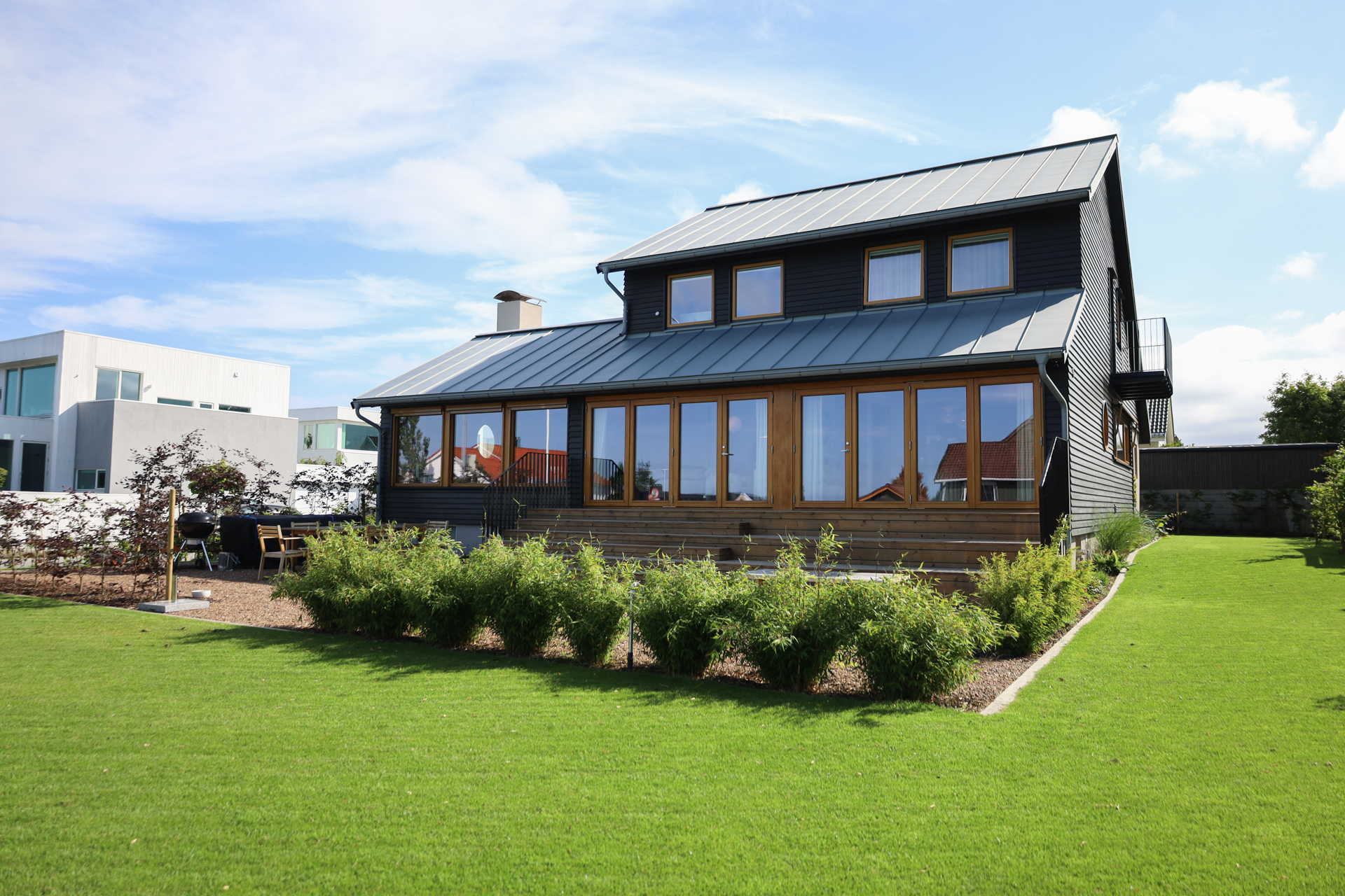 Totalrenovert, svartmalt bolig fra 1959 med runde vinduer, på Madla i Stavanger.